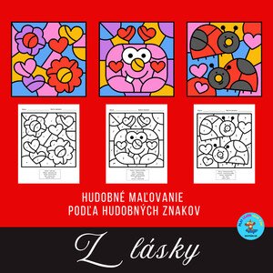 Vymaľuj si obrázok podľa hudobných znakov. Piano, forte, husľový kľúč, basový kľúč, pomlčky a noty. Vymaľovaný obrázok