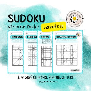 Súbor obsahuje 4 rôzne typy úloh sudoku s veľkosťou 9x9, ktoré sú vhodné napríklad ako bonusové úlohy pre šikovné