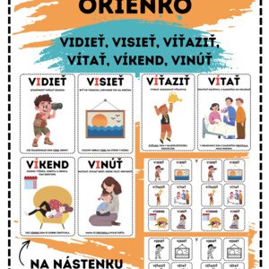 MATERIÁL OBSAHUJE: -6 pojmov: VIDIEŤ, VISIEŤ, VÍTAŤ, VÍŤAZIŤ, VÍKEND, VINÚŤ (2 pojmy na jednej strane - výzdoba triedy +