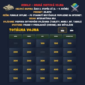 🪖 Riskuj!: Totálna Vojna Premeňte hodinu dejepisu na napínavý súboj vedomostí! Táto digitálna hra prenáša obľúbený