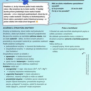 Materiál ponúka prehľadné a zrozumiteľné spracovanie témy enzýmov pre stredné školy do ucelenej, premyslenej hodiny