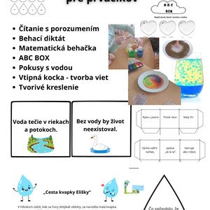 Materiál obsahuje: úlohy z čítania ( motivačný príbeh o kvapke Eliške, čítanie s porozumením, vtipná kocka), matematiky