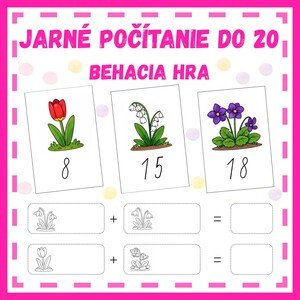 Čo materiál obsahuje: • 10 kartičiek s jarnými kvetmi a číslami • 2 pracovné listy • 8 príkladov na sčítanie do 20 • 8