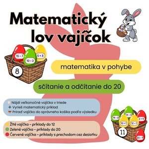 Veľkonočná pohybová aktivita pre žiakov 1. ročníka, ktorá hravou formou precvičuje sčítanie a odčítanie do 20. Žiaci