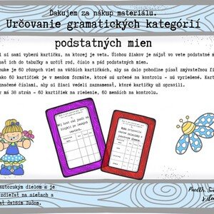 Žiaci si sami vyberú kartičku, na ktorej je veta. Úlohou žiakov je nájsť vo vete podstatné mená, zapísať ich do tabuľky