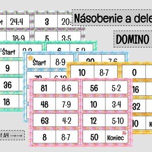 DOMINO - súbor obsahuje 5 hier na nácvik násobenia a delenia (malá násobilka). 1.hra: násobenie 0 - 4 (3 strany A4) 2