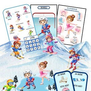Materiál obsahuje: 45 strán 15 plagátov zimné športy pracovné listy kartičky na precvičovanie grafomotoriky omaľovánka