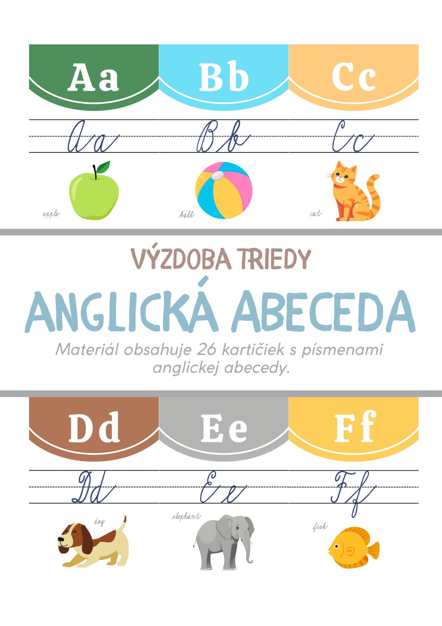 Materiál obsahuje 26 kartičiek s písmenami anglickej abecedy. Pri každom písmenku sa nachádza obrázok aj s pomenovaním. Primárne využitie materiálu je na výzdobu triedy.