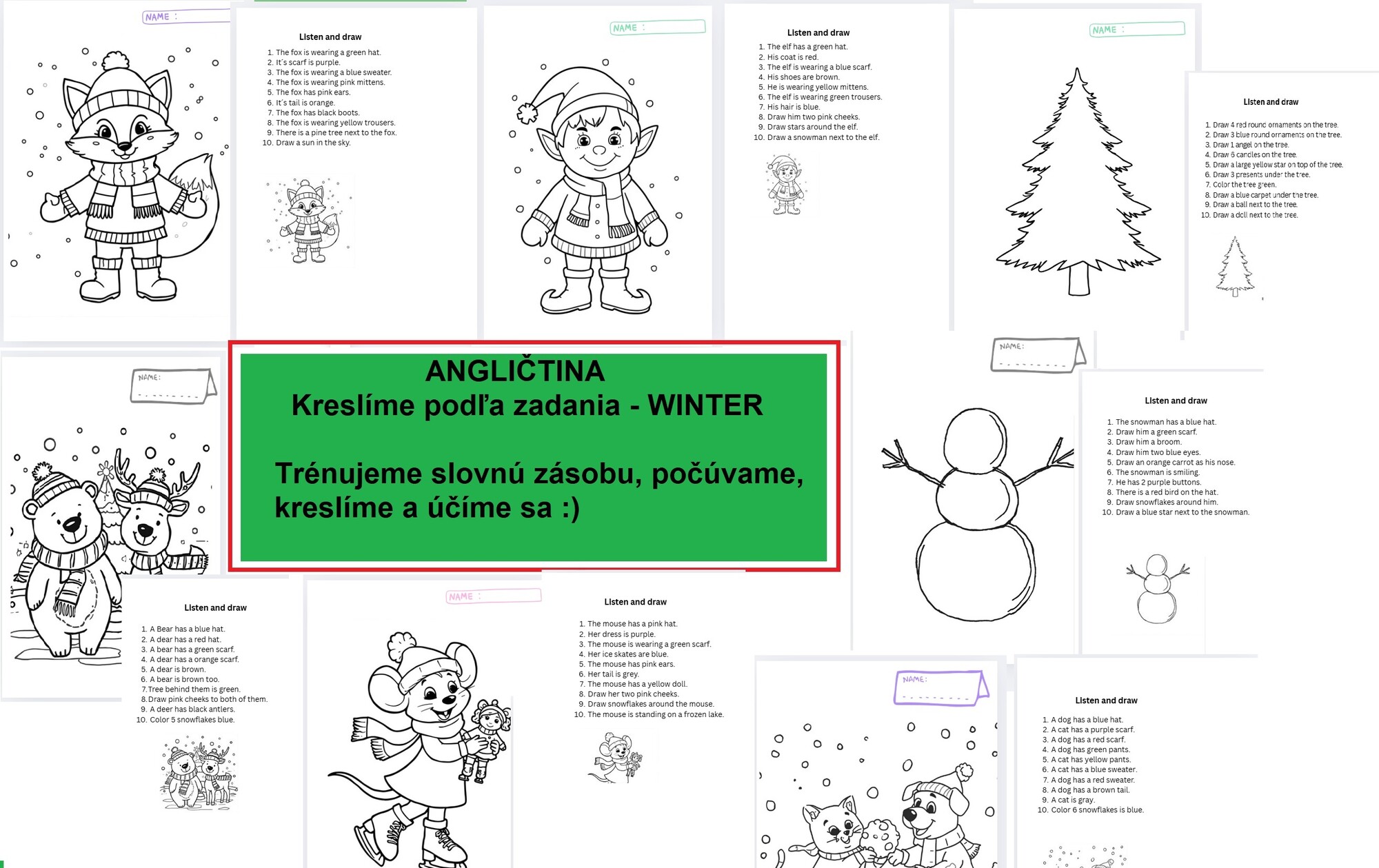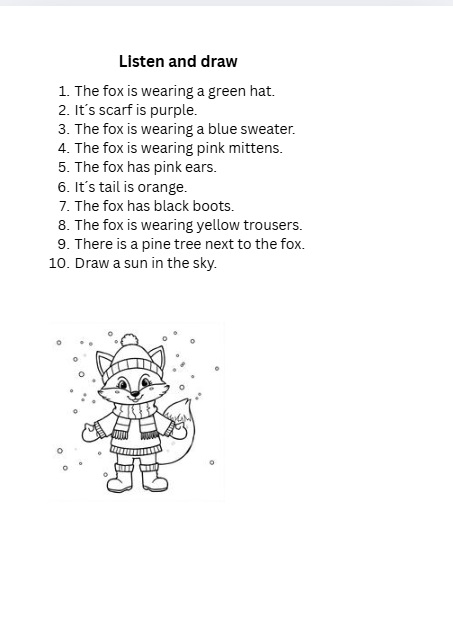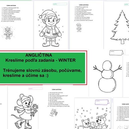 Toto cvičenie je vynikajúce pre rozvoj AKTÍVNEHO POČÚVANIA a overenie POROZUMENIA na najnižšej úrovni. Deti sú nútené počúvať, spracovať cudzí jazyk a ich úspech sa okamžite odzrkadlí v ich kresbe.