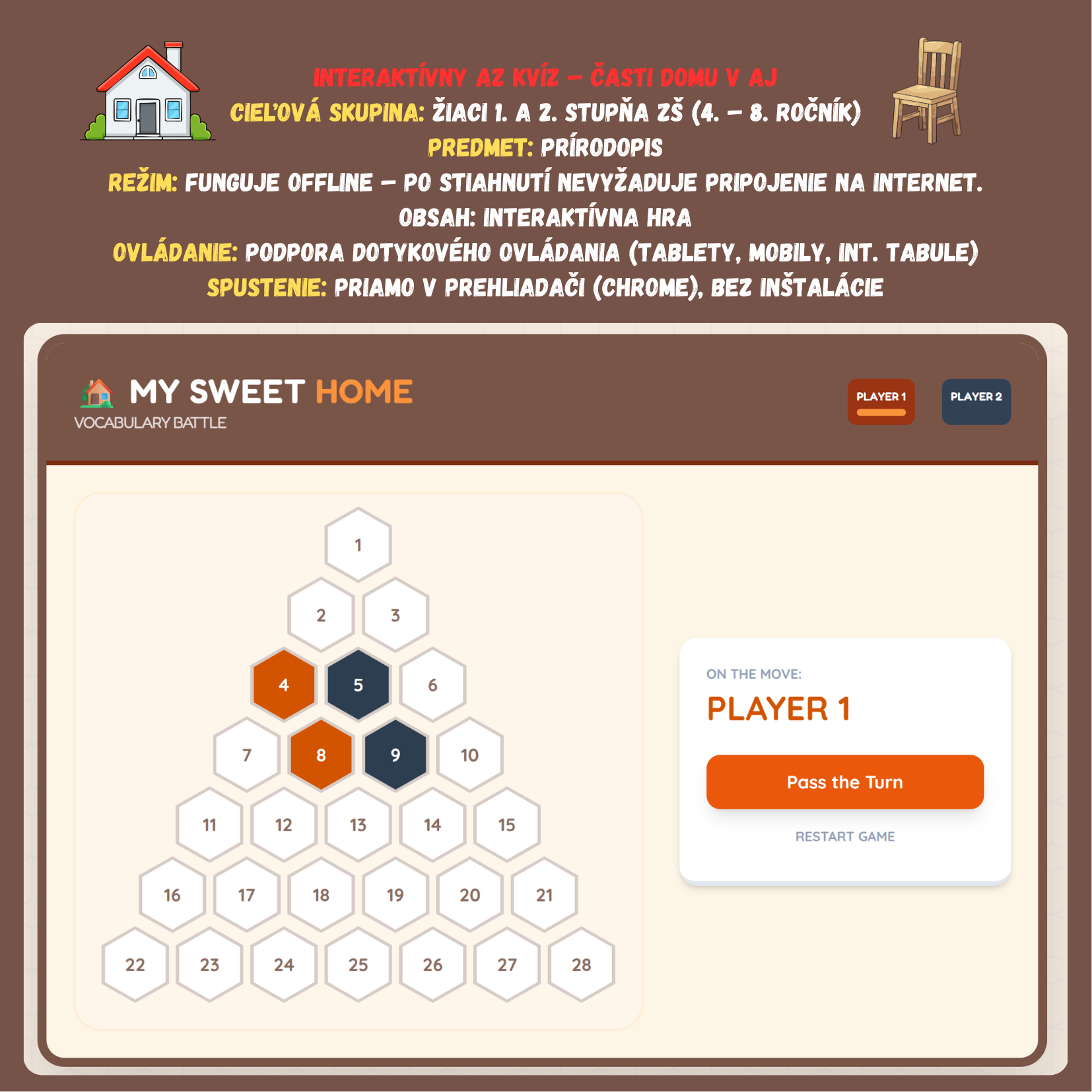 - Interaktívnu hru vo formáte .html Cieľ aktivity: Precvičiť anglickú slovnú zásobu na tému „Domov“ interaktívnou a vysoko motivujúcou formou, ktorá aktivuje celú triedu a upevní správne používanie termínov v kontexte.