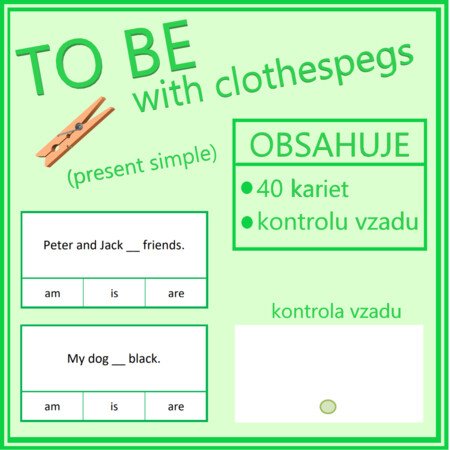 Obľúbená aktivita s štipcami na precvičenie slovesa BYŤ v angličtine. Obsahuje jednoduché vety v prítomnom jednoduchom čase. Žiak pomocou štipca alebo sponky označí správny tvar slovesa (am, is, are). Po otočení kartičky žiak rovno vidí, či zvolil možnosť dobre. Materiál stačí obojstranne vytlačiť, prípadne zalaminovať a nastrihať.