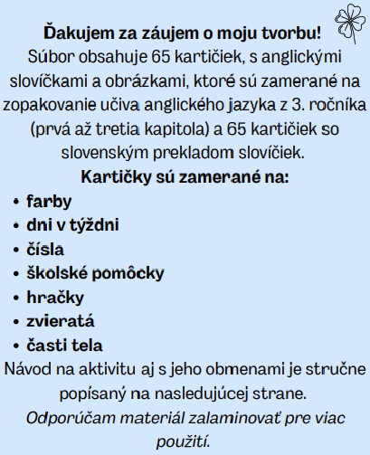 Bingo kartičky/pexeso, možnosť na zopakovanie slovnej zásoby v anj kapitola 1 až 3. Možnosť využiť pri hromadnom skúšaní/skupinovom/individuálnom.