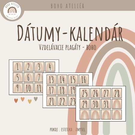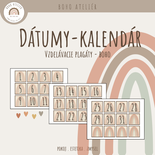 Kalendár je zároveň dekoratívnym prvkom triedy a je farebne aj štýlovo zladený s ďalšími materiálmi Boho atelier, ako sú abeceda, čísla, násobilka a ďalšie edukačné prvky. Vďaka tomu si učiteľky môžu vytvoriť jednotný, moderný a harmonický priestor, ktorý je veľmi obľúbený u detí aj pedagógov.