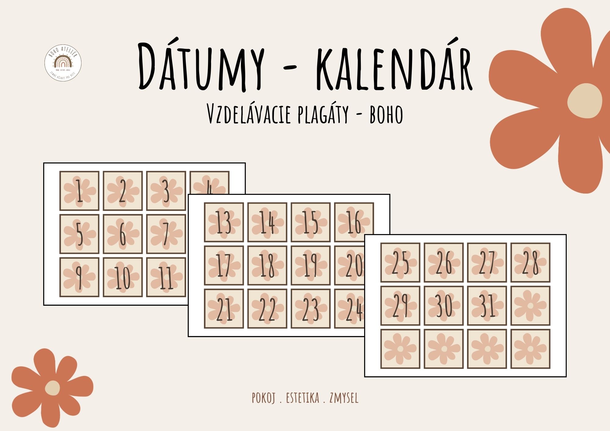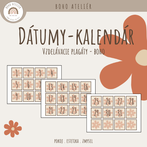 Didaktický triedny kalendár od Boho atelier je moderný vzdelávací materiál v boho štýle, navrhnutý s dôrazom na harmóniu, jednoduchosť a upokojujúce farby. Je vhodný do tried materských a základných škôl. Súbor obsahuje číselné dátumy 1-31 s motívom kvietku.