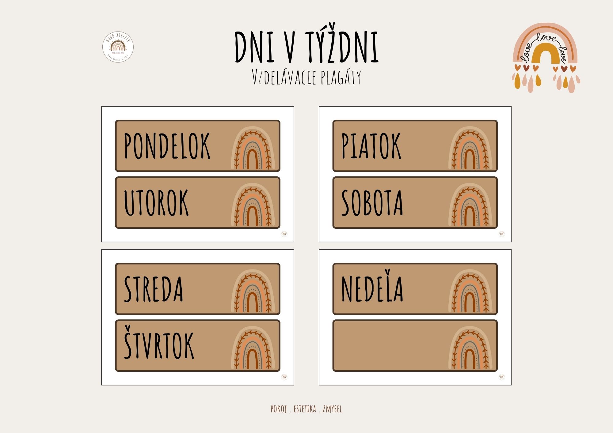 Sada boho plagátov s dňami v týždni, navrhnutá ako súčasť modulárneho triedneho kalendára. Plagáty slúžia ako základný prvok, ku ktorému je možné dopĺňať ďalšie časti podľa potrieb a predstáv učiteľa.