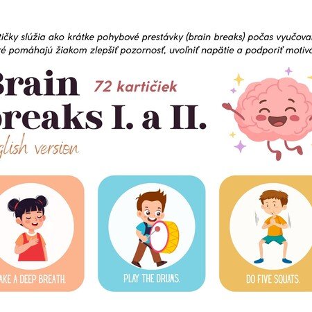 Materiál obsahuje 72 kartičiek brain breaks v Anglickom jazyku (ide o veľký balík mojich materiálov Brain breaks I. a Brain breaks II.). Kartičky slúžia ako krátke pohybové prestávky (brain breaks) počas vyučovania, ktoré pomáhajú žiakom zlepšiť pozornosť, uvoľniť napätie a podporiť motiváciu.