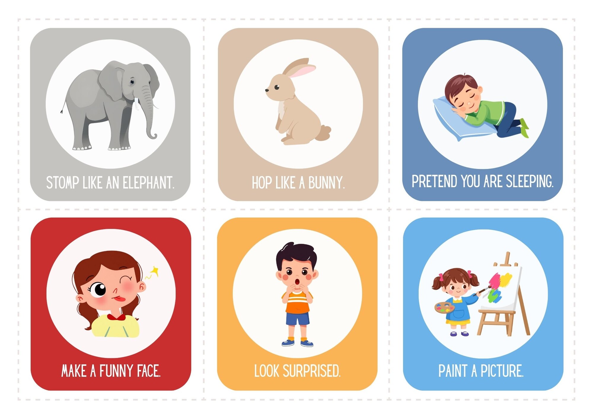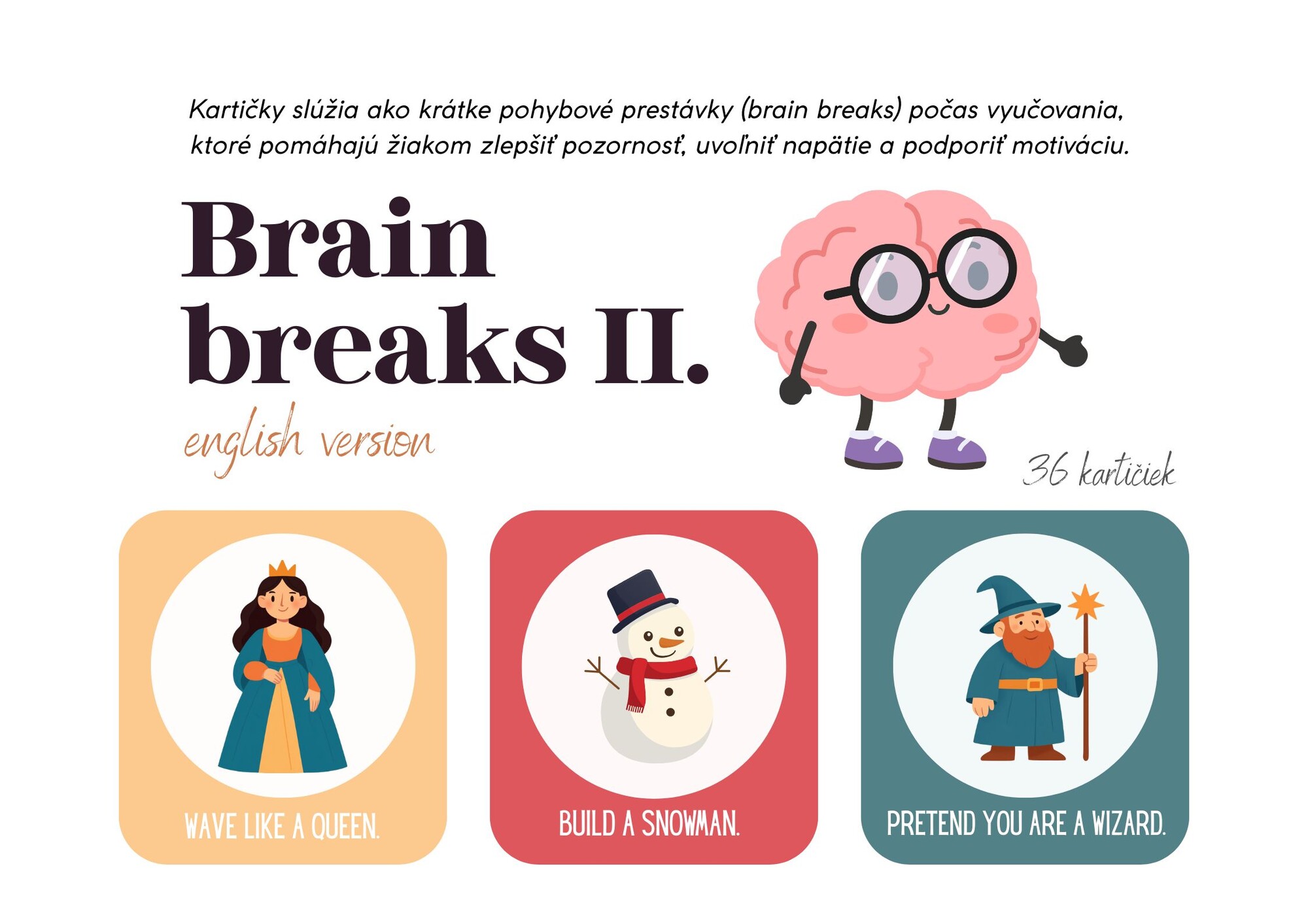 Materiál obsahuje 36 kartičiek brain breaks v Anglickom jazyku. Kartičky slúžia ako krátke pohybové prestávky (brain breaks) počas vyučovania, ktoré pomáhajú žiakom zlepšiť pozornosť, uvoľniť napätie a podporiť motiváciu.