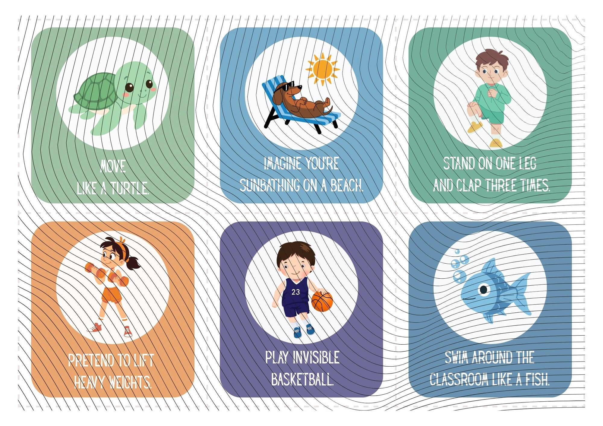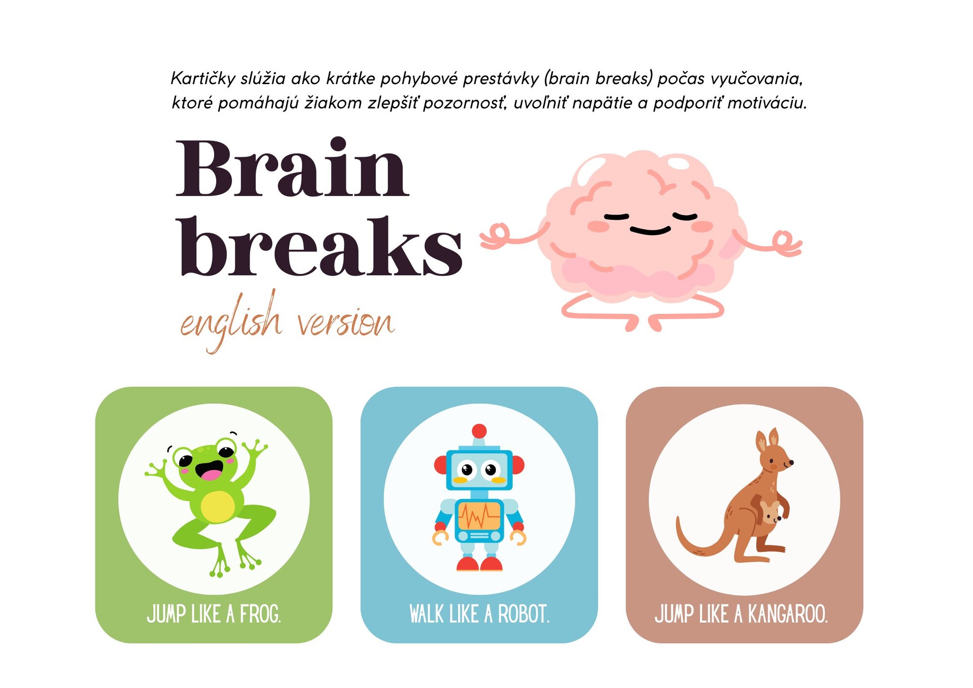 Materiál obsahuje 36 kartičiek brain breaks v Anglickom jazyku. Kartičky slúžia ako krátke pohybové prestávky (brain breaks) počas vyučovania, ktoré pomáhajú žiakom zlepšiť pozornosť, uvoľniť napätie a podporiť motiváciu.