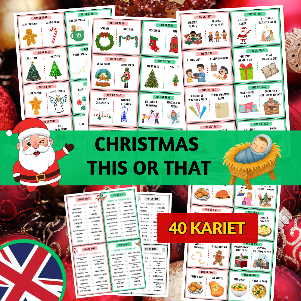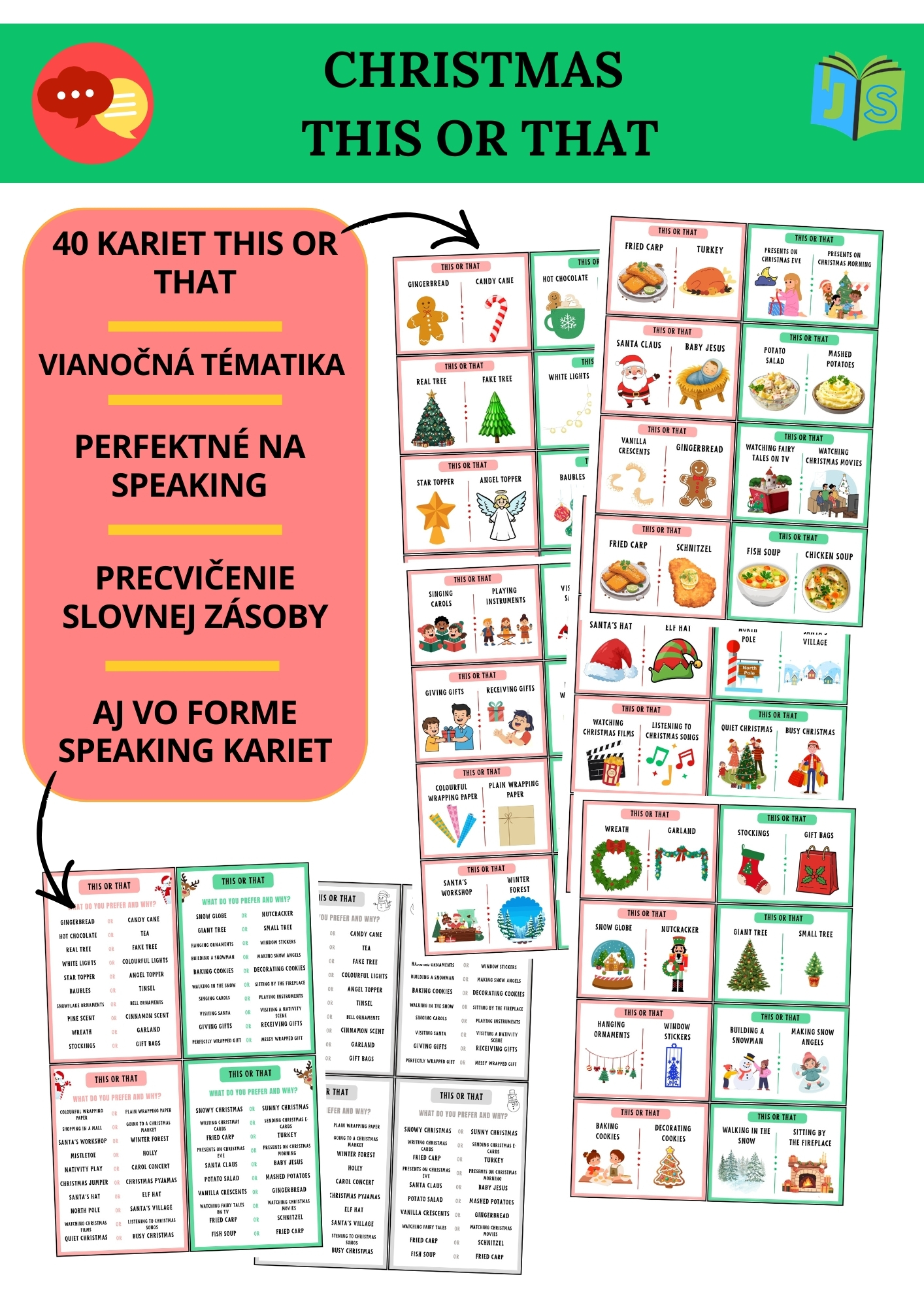 Christmas This or That ponúka zábavný spôsob, ako rozvíjať rozprávanie, slovnú zásobu a sebavedomie žiakov v angličtine. Súbor obsahuje 40 kartičiek na tlač. Kartičky obsahujú jednoduché voľby (napr. Gingerbread or candy cane?) a úlohou žiakov je nielen vybrať jednu možnosť, ale aj ju krátko vysvetliť. Aktivita podporuje spontánnosť prejavu, používanie prídavných mien, argumentáciu aj diskusiu. Materiál je vhodný na prácu vo dvojiciach, skupinách aj s celou triedou – ako warm-up, filler, konverzačná hra alebo zábavná vianočná aktivita.