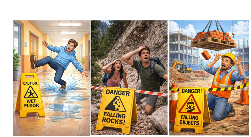 Materiál pozostáva zo série ilustrácií / fotografií zobrazujúcich bežné nebezpečné situácie, s ktorými sa žiaci môžu stretnúť v škole, doma alebo na verejnosti (napr. hlasná hudba v slúchadlách, ťažký nákup, nepozornosť na priechode, horúca voda, zakopnutie o batoh, nesprávne sedenie pri počítači).