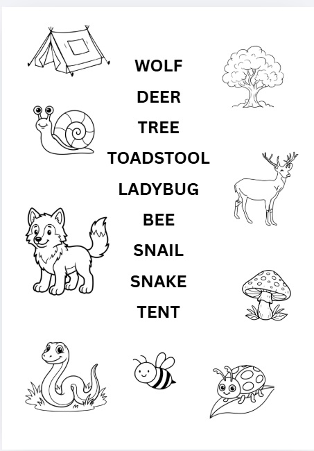 Obsahuje slová: WOLF, DEER, TREE, TOADSTOOL, LADYBUG, BEE, SNAIL, SNAKE, TENT, PINECONE, BEAR, FOREST, BAT, OWL, FOX, TREE STUMP, FROG, HEDGEHOG,