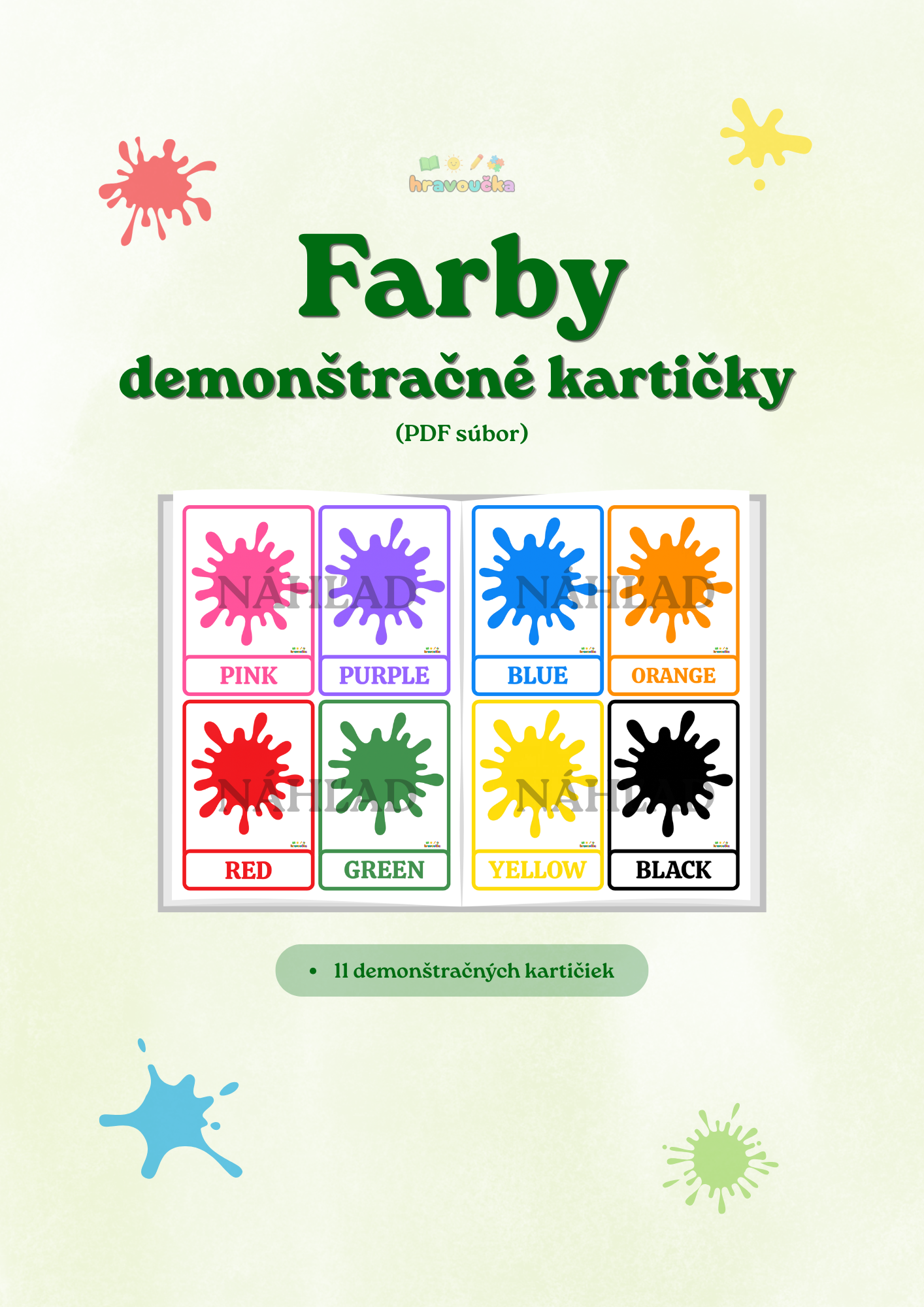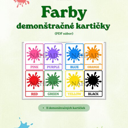 Súbor obsahuje 11 kariet zameraných na poznávanie základných farieb. Každá karta obsahuje farebnú škvrnu a anglický názov farby.