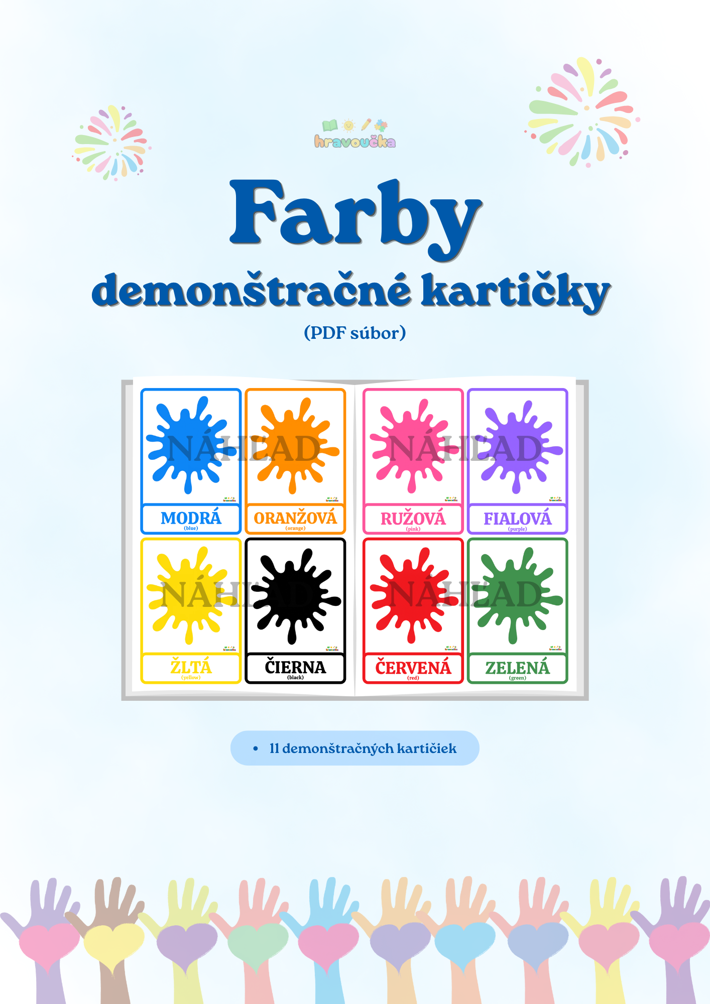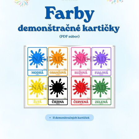 Súbor obsahuje 11 kariet zameraných na poznávanie základných farieb. Každá karta obsahuje farebnú škvrnu, slovenský názov farby a anglický preklad v zátvorke.