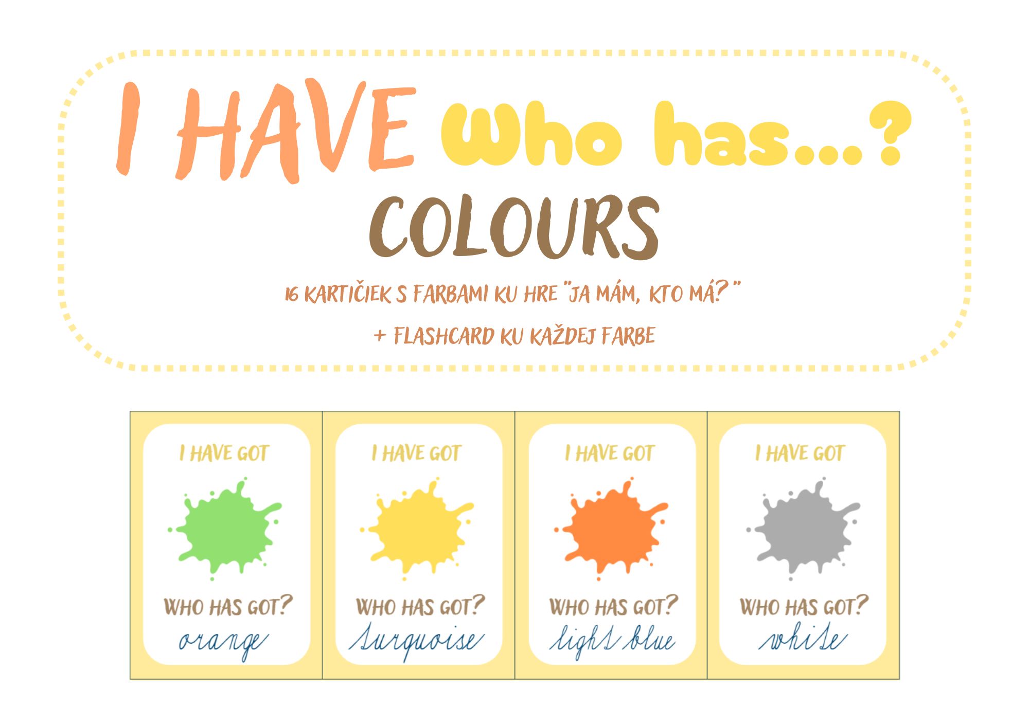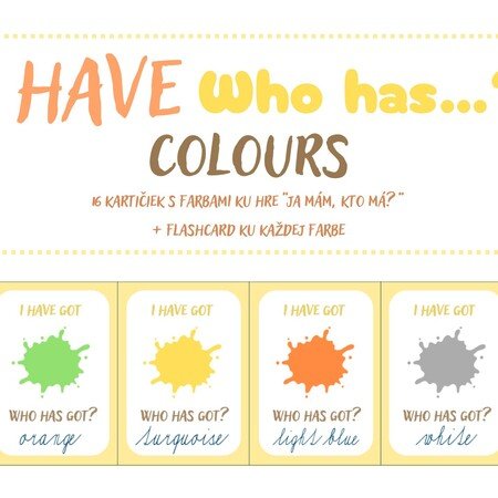 Didaktická hra „I have, who has?“ zameraná na tému colours je vhodná pre žiakov 1. – 3. ročníka ZŠ. Žiaci si hravou formou precvičia slovnú zásobu, jednoduché vetné konštrukcie a pozornosť pri počúvaní.