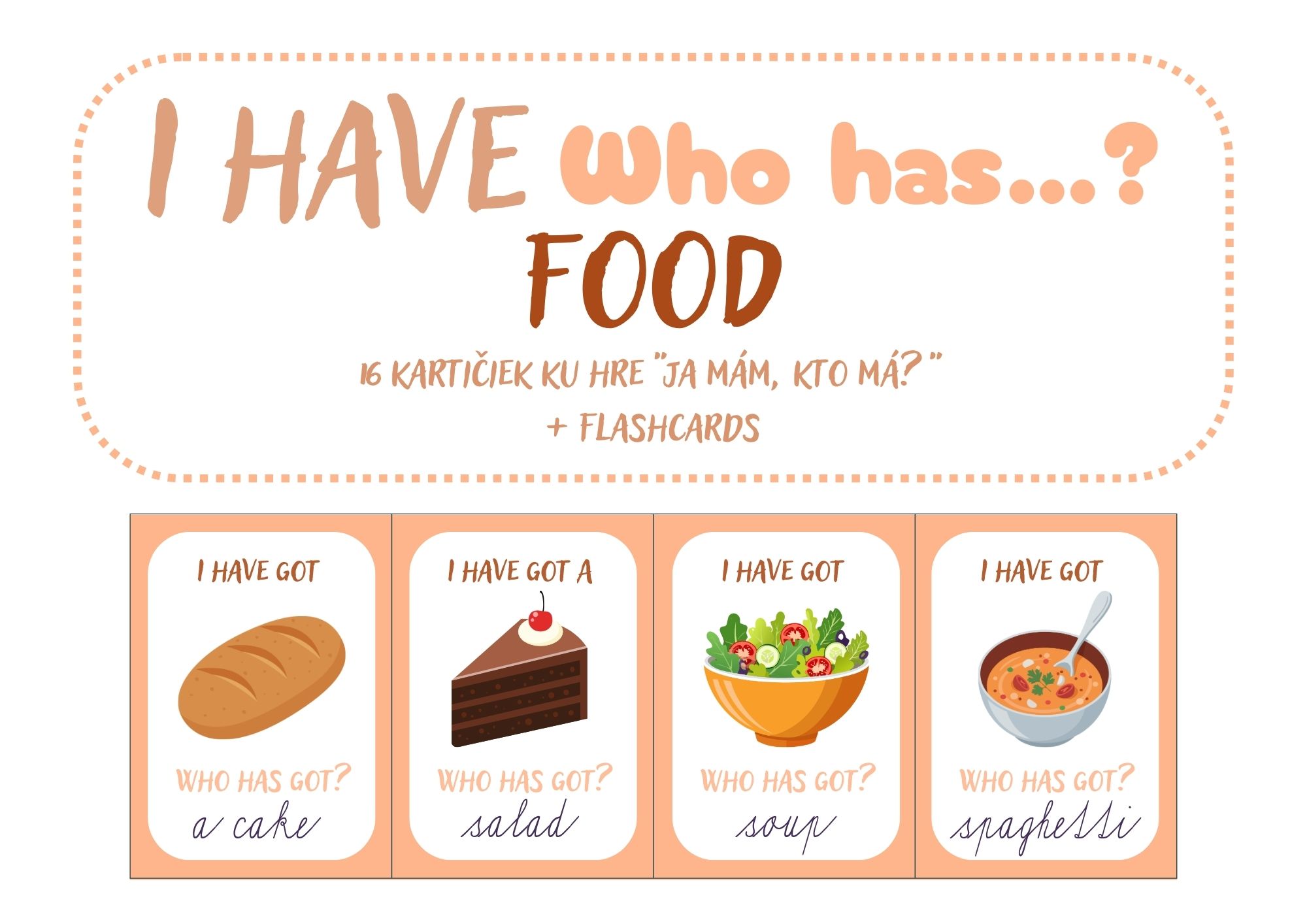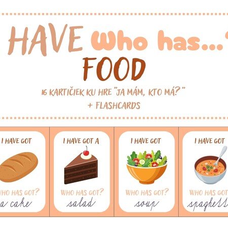 Didaktická hra „I have, who has?“ zameraná na tému FOOD je vhodná pre žiakov 1. – 3. ročníka ZŠ. Hravou formou si žiaci precvičia slovnú zásobu, jednoduché vetné konštrukcie a pozornosť pri počúvaní.