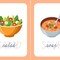 Zoznam slov: sushi, meat, rice, egg, bread, cake, salad, soup, spaghetti, sandwich, pizza, hot dog, pancakes, fish, bacon, fries