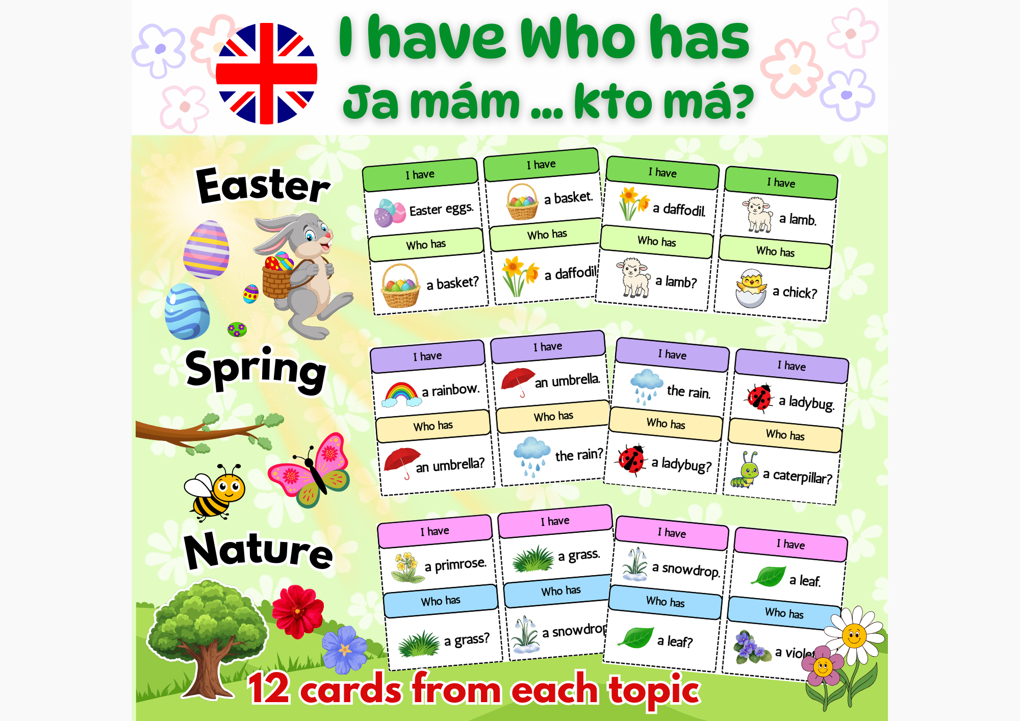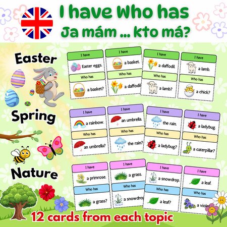 Súbor obsahuje spolu 36 kariet (12 kariet z každej témy) s veselými jarnými ilustráciami a slovnou zásobou rozdelenou do troch tematických okruhov: