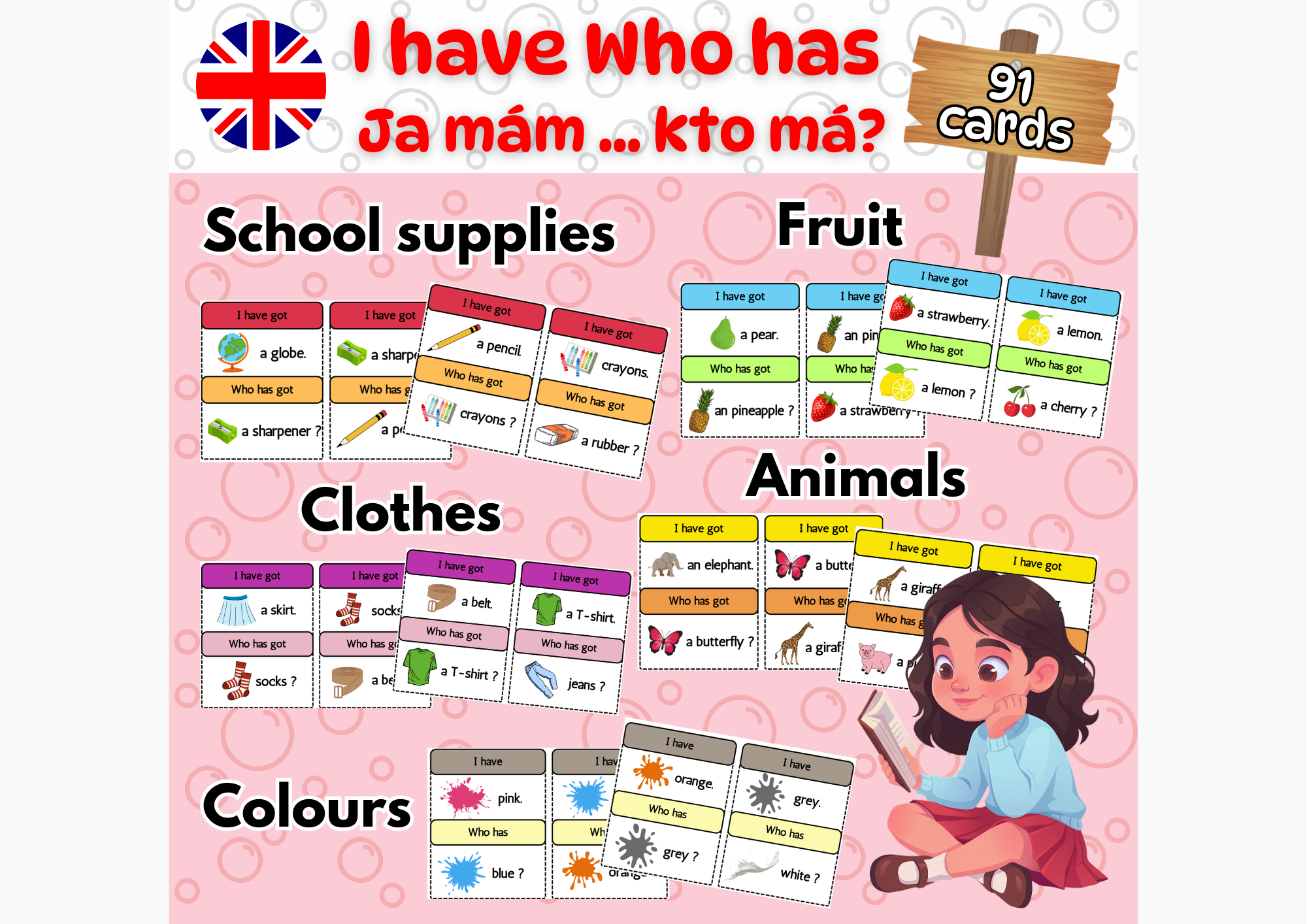 Kartičky ponúkam na témy - školské pomôcky, zvieratá, ovocie, farby a oblečenie.