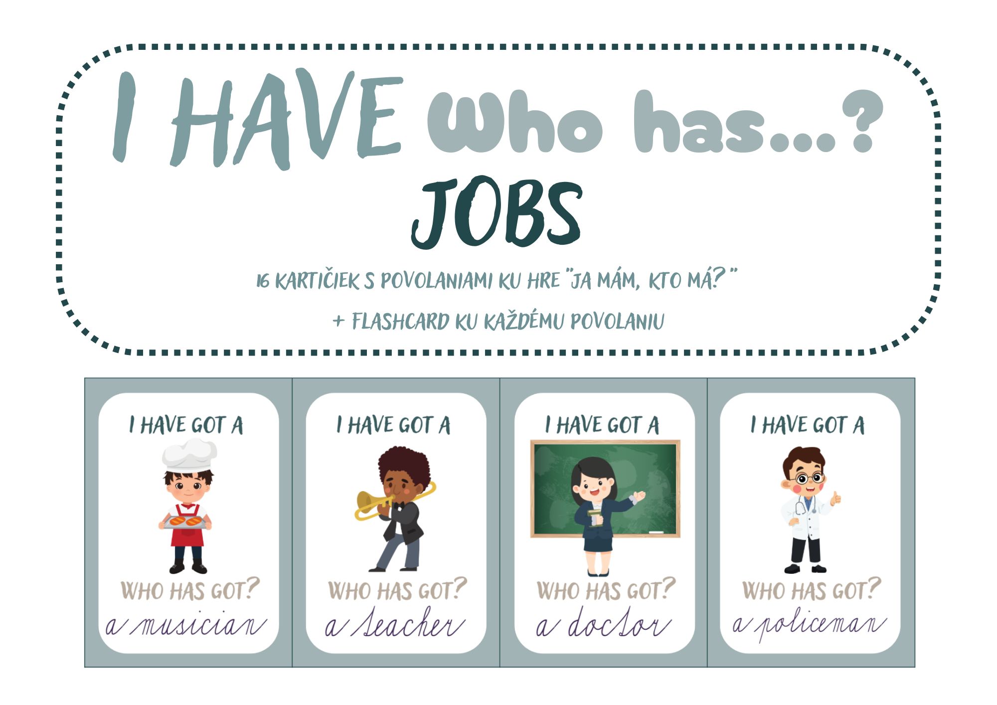 Didaktická hra „I have, who has?“ zameraná na tému JOBS je vhodná pre žiakov 1. – 3. ročníka ZŠ. Žiaci si hravou formou precvičia slovnú zásobu, jednoduché vetné konštrukcie a pozornosť pri počúvaní.