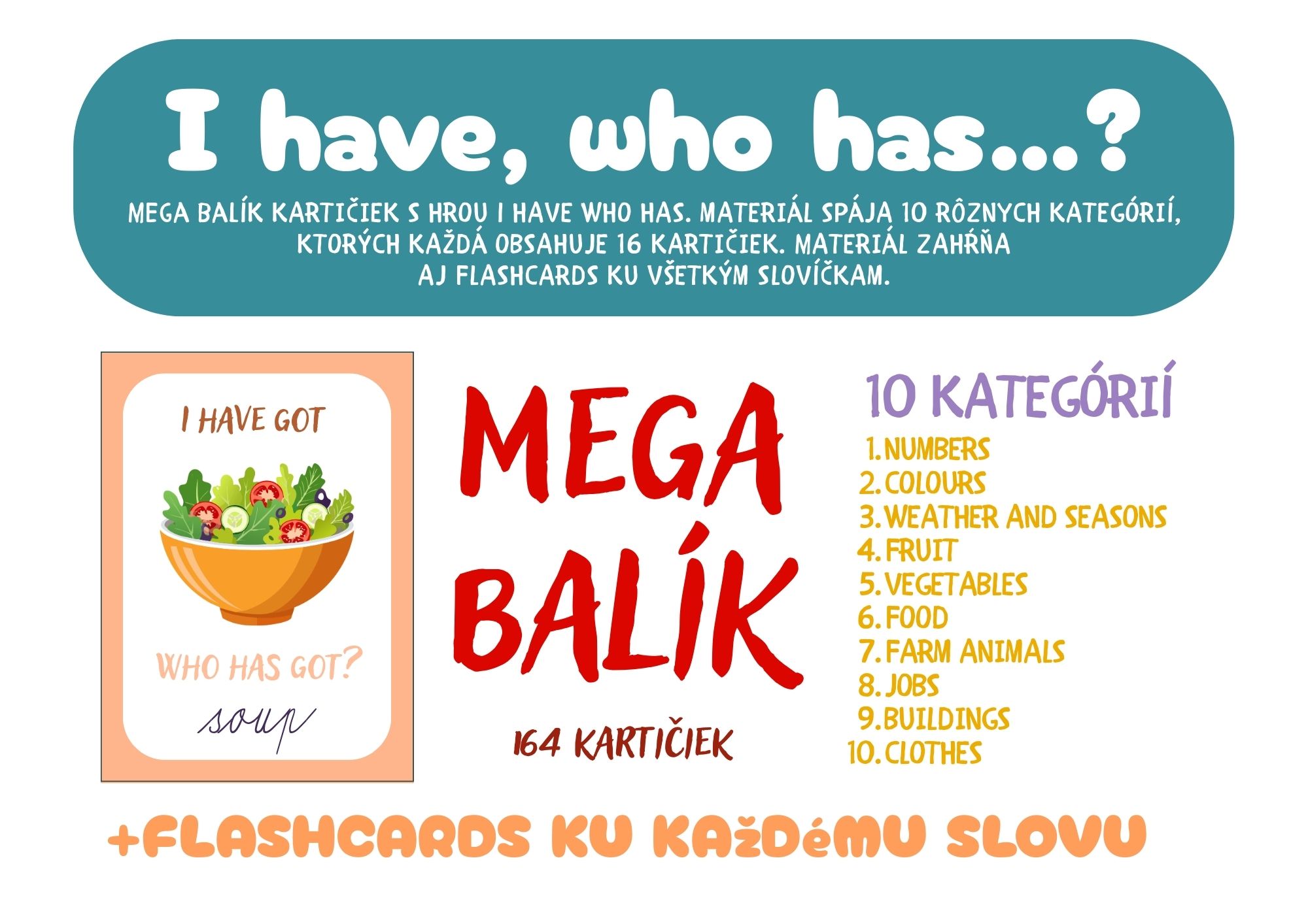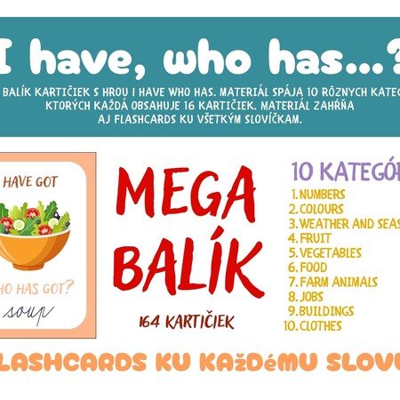 MEGA balík obsahuje 10 kategórií (každá kategória obsahuje 16 kartičiek):