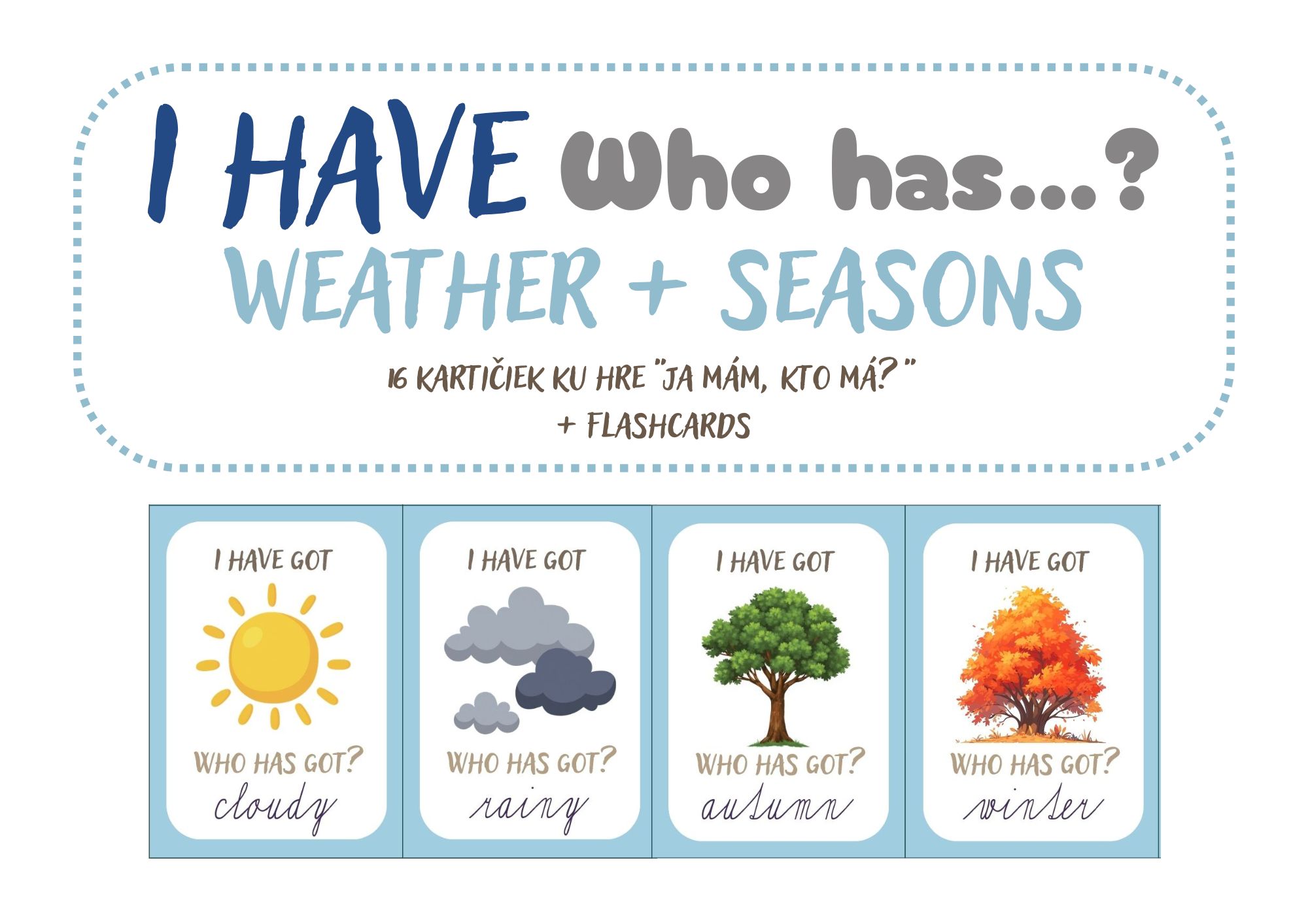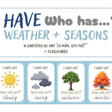 Didaktická hra „I have, who has?“ zameraná na tému Weather and Seasons je vhodná pre žiakov 1. – 3. ročníka ZŠ. Žiaci si hravou formou precvičia slovnú zásobu, jednoduché vetné konštrukcie a pozornosť pri počúvaní.