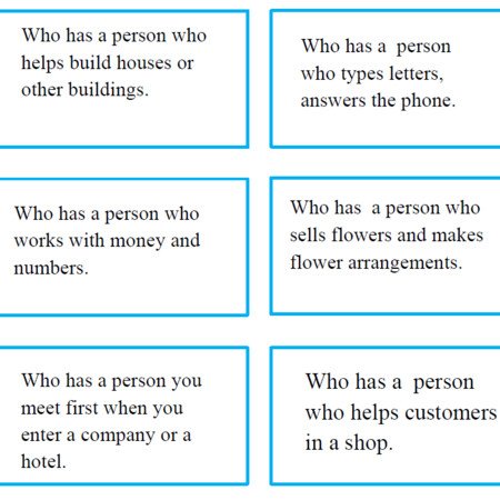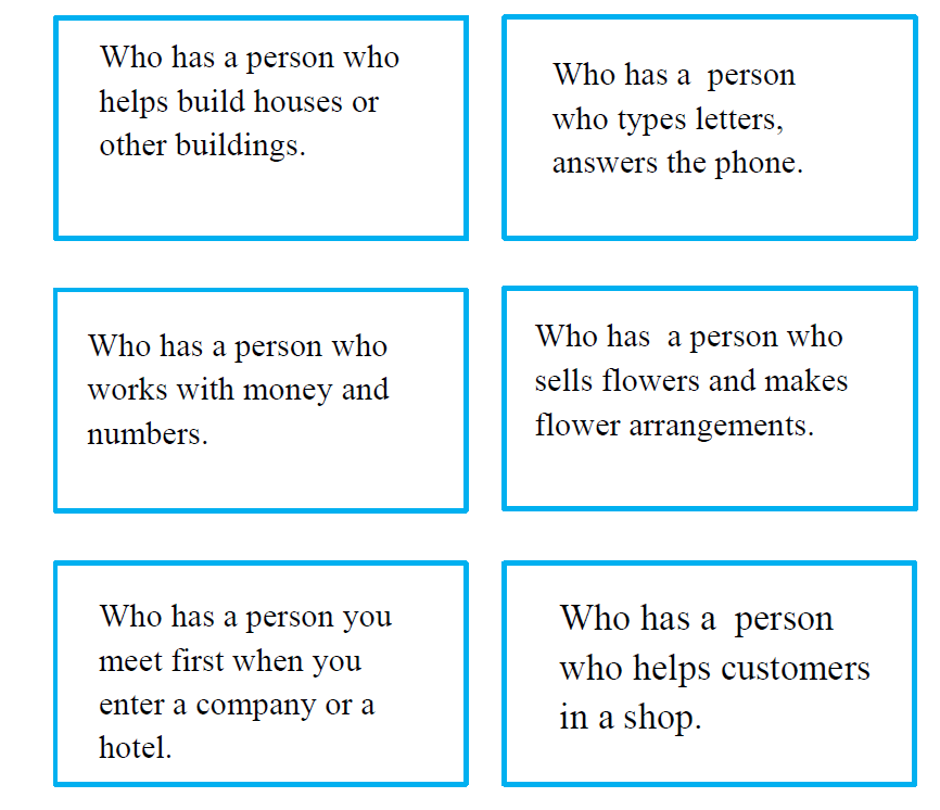 Materiál je vhodný na skupinovú alebo celo triednu jazykovú hru. Každý žiak dostane jednu alebo viac kariet. Jeden žiak prečíta otázku z kartičky, napríklad: Who has a person who drives a bus? Žiak, ktorý má kartu so správnym povolaním, sa prihlási a odpovie, napríklad: I have a bus driver, prípadne kartu pridá do stredu alebo ju ukáže ostatným. Aktivita potom pokračuje ďalšou otázkou. Takýmto spôsobom si žiaci opakovane precvičujú názvy povolaní, porozumenie opisom, počúvanie aj ústne reagovanie v angličtine.