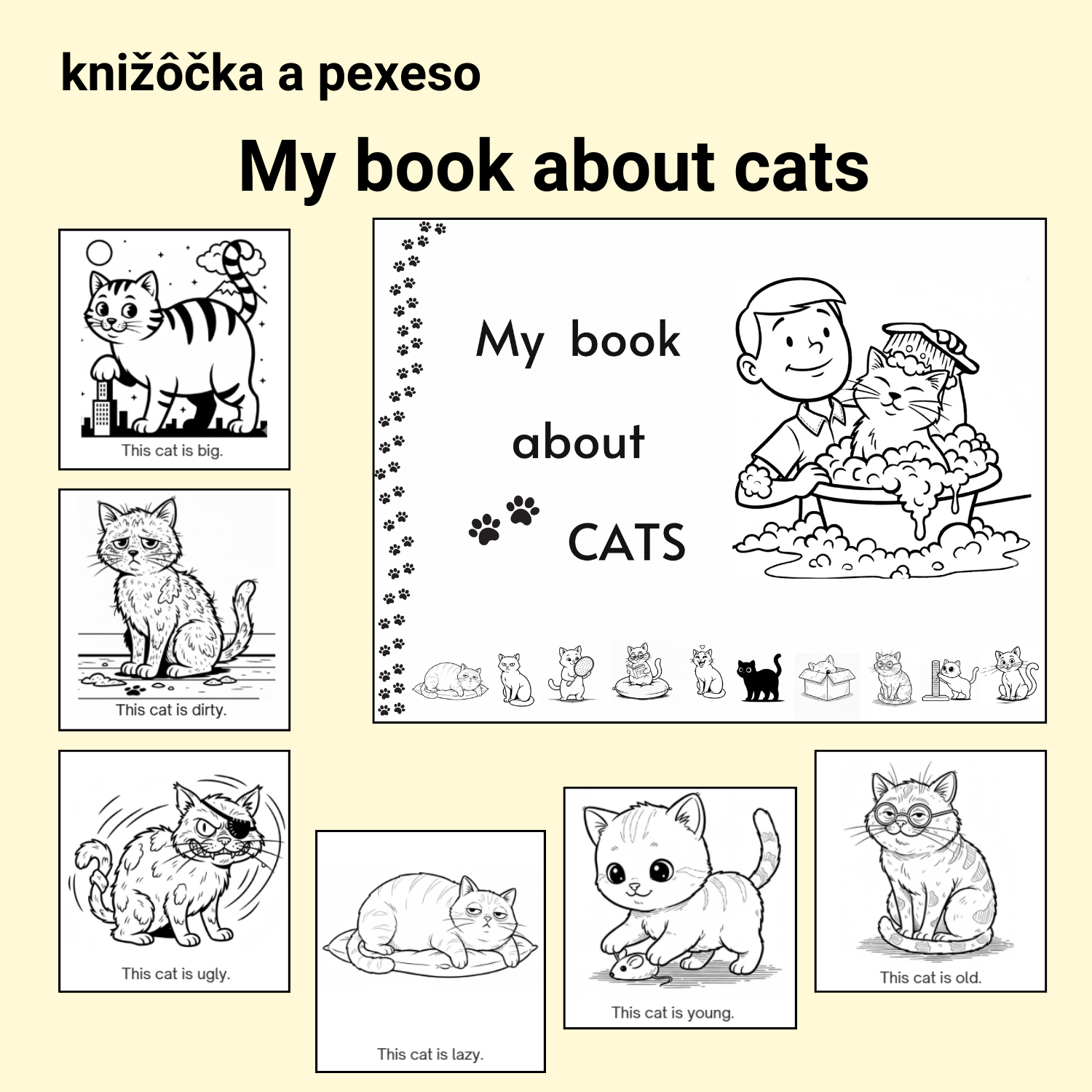 Kľúčové slová: angličtina pre začiatočníkov, zvieratká, mačky, animals, pexeso, prvé čítanie, pracovné listy angličtina, vyfarbovanie, hravé učenie.