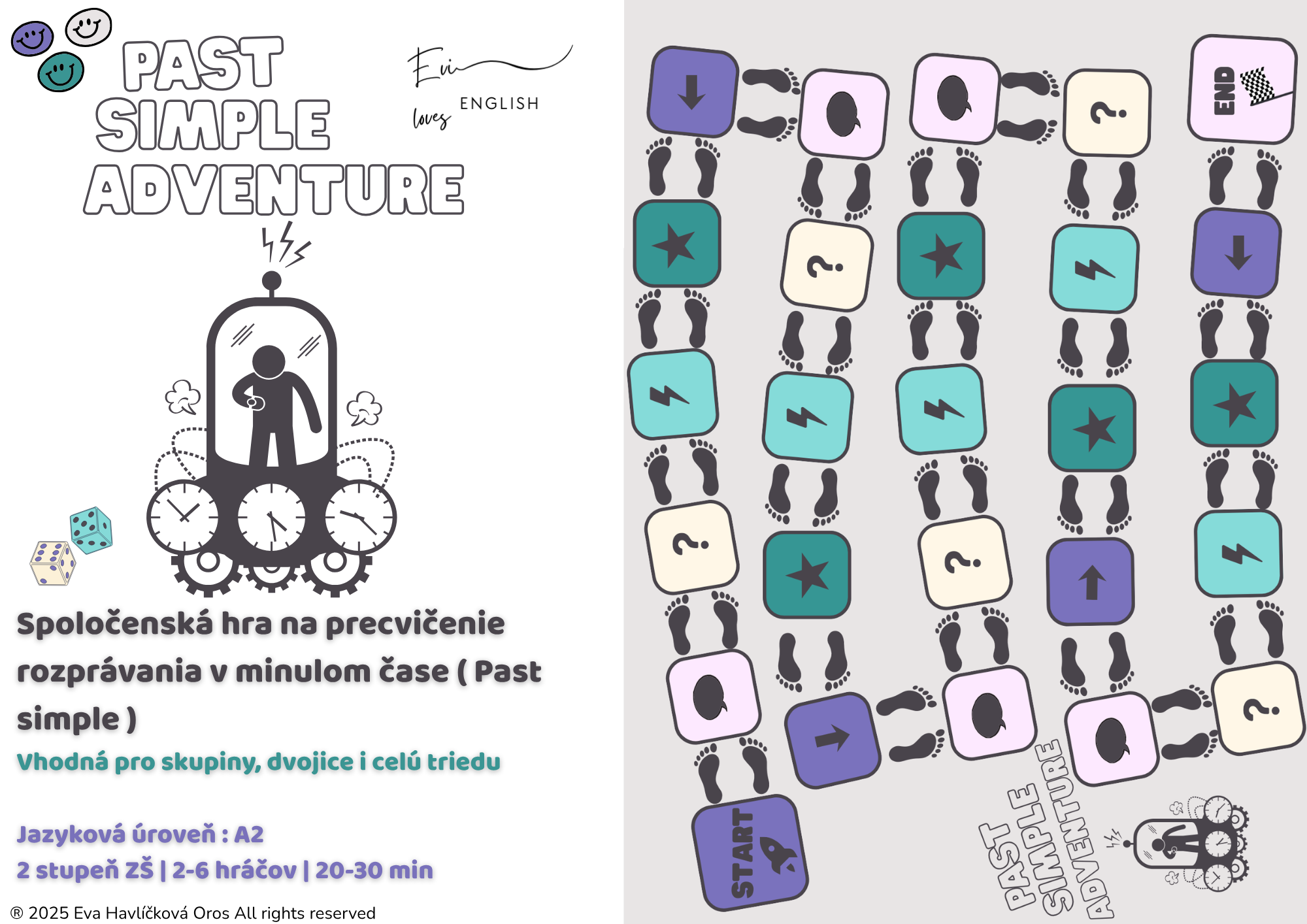 Hra Past Simple Adventure je vytvorená pre učiteľov, ktorí chcú svoje hodiny oživiť, podporiť prirodzenú komunikáciu a zároveň študentom pomôcť upevniť minulý čas jednoduchý (Past Simple) hravou a nenásilnou formou.
