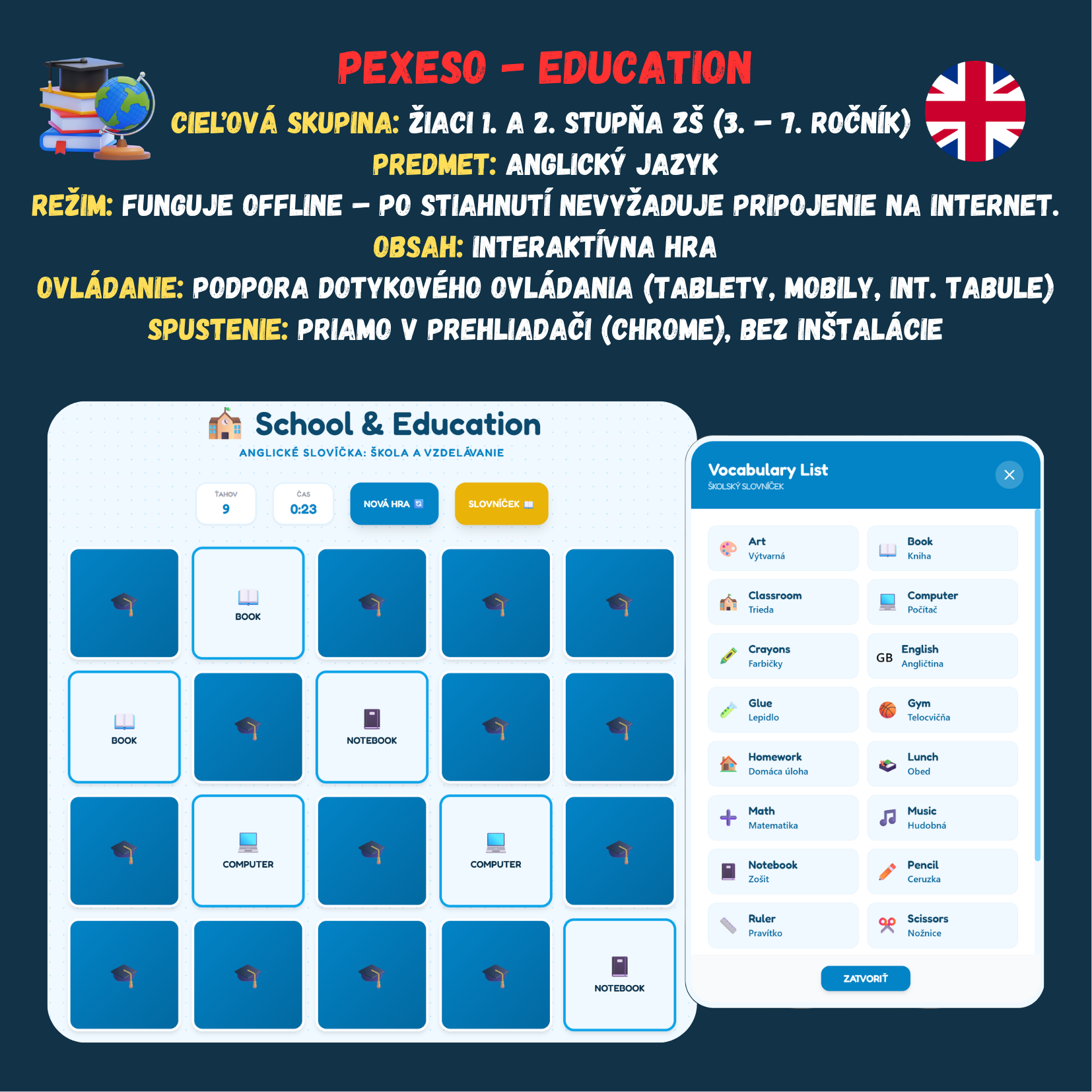Premeňte hodinu angličtiny na zábavný tréning pamäte a slovíčok! Táto digitálna hra prenáša klasické pexeso do moderného prostredia školskej triedy. Žiaci si hravou formou precvičia a upevnia základnú slovnú zásobu spojenú so školskými pomôckami, predmetmi a prostredím.