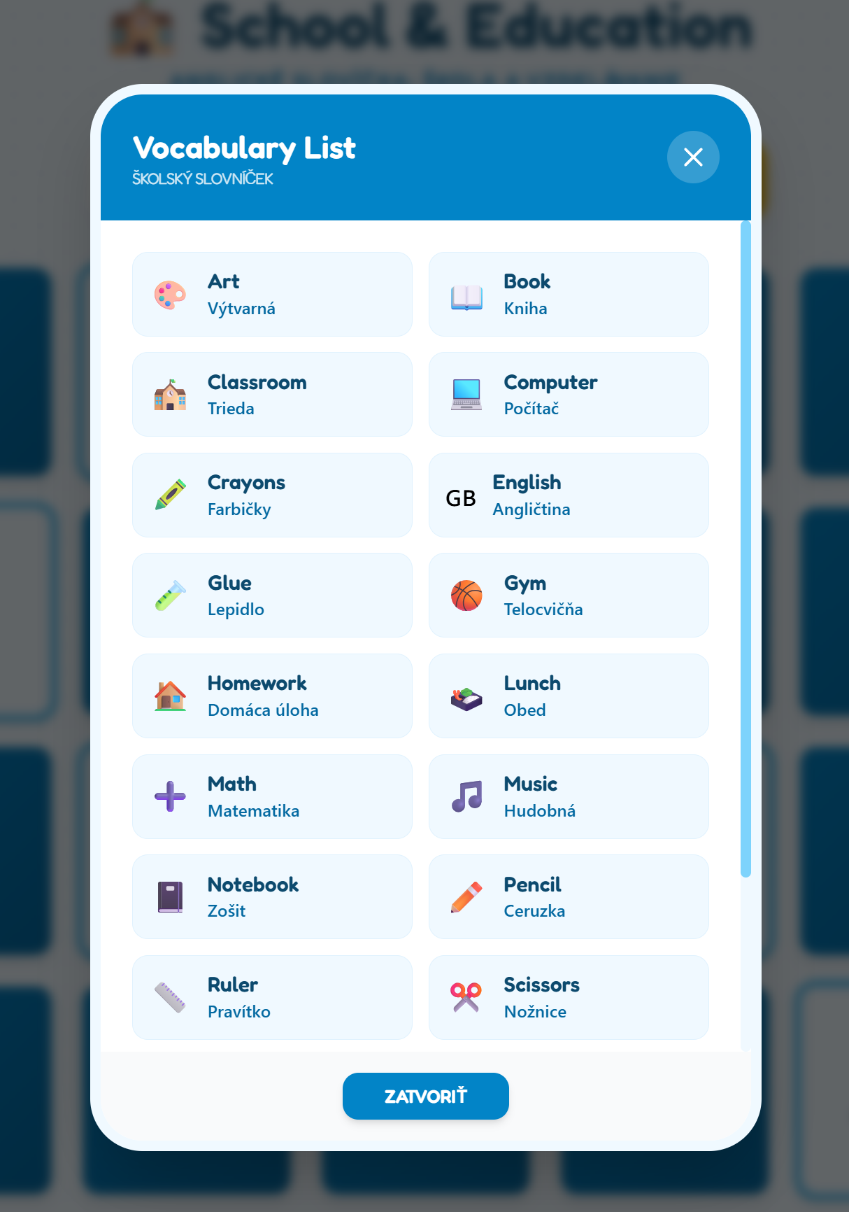- 20 tematických slovíčok: Od pomôcok (School bag, Pencil, Scissors) cez predmety (Math, Art, English) až po personál a miestnosti (Teacher, Classroom, Gym).
