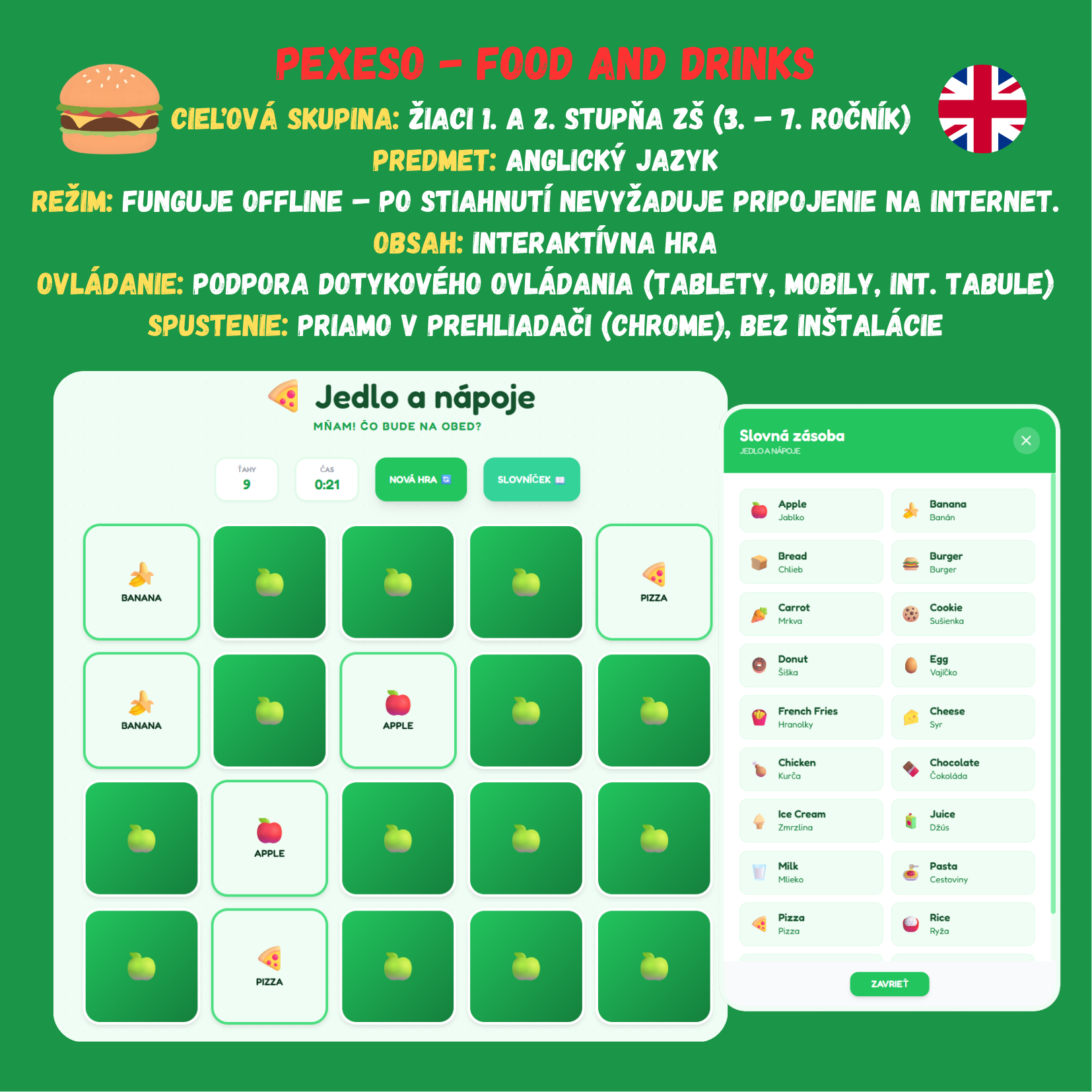 - Interaktívne prvky: Zvukové efekty pre otočenie karty, nájdenie zhody alebo chybu. Súčasťou je aj integrovaný obrázkový slovníček s prekladom.