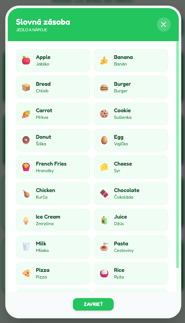 Cieľ aktivity: Precvičiť základnú slovnú zásobu na tému "Jedlo a pitie" interaktívnou a vysoko motivujúcou formou, ktorá upevňuje spojenie medzi slovom, obrázkom a významom.