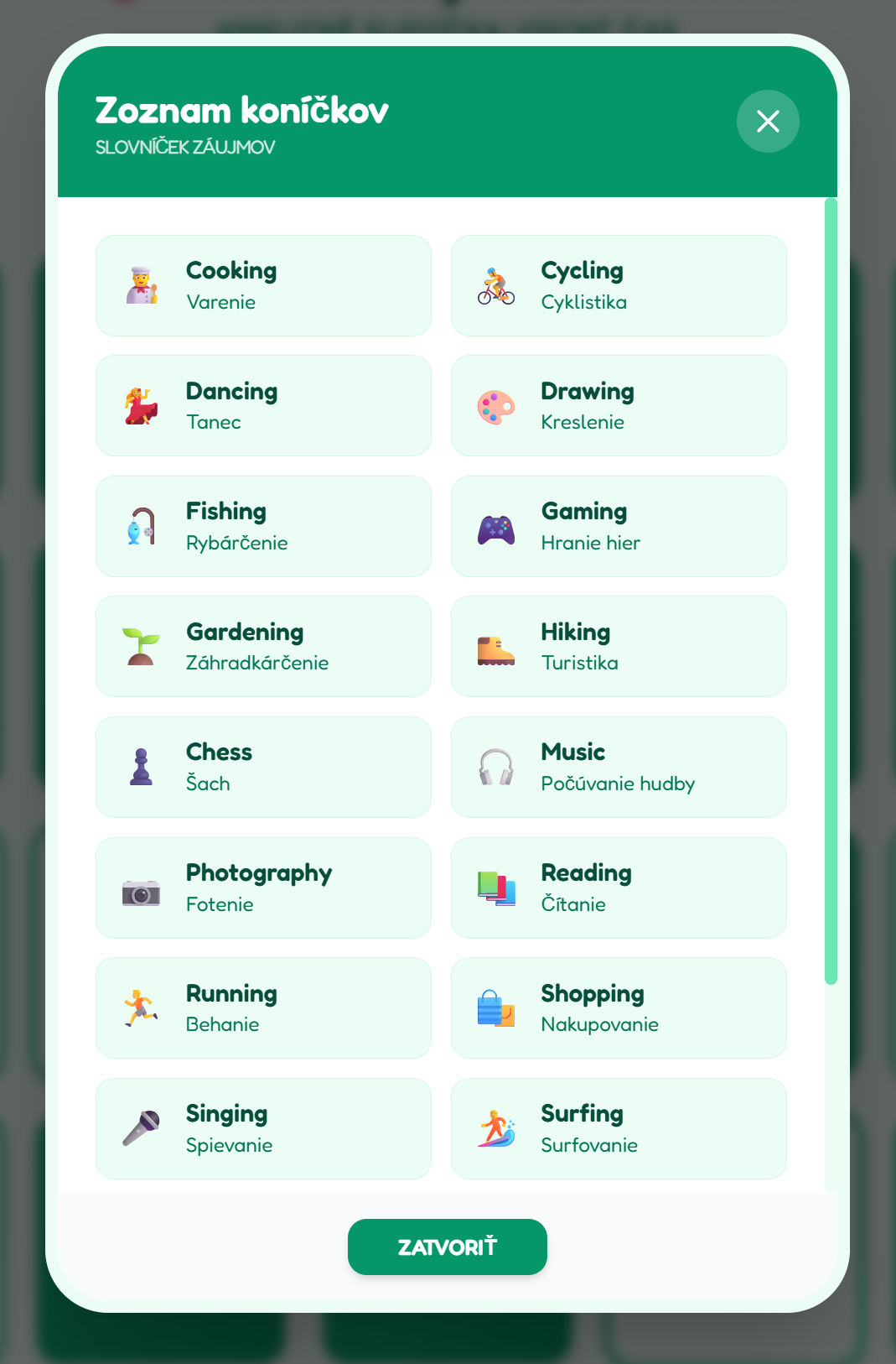 - 20 slovíčok: Pokrýva všetko od športu cez umenie až po relaxáciu.