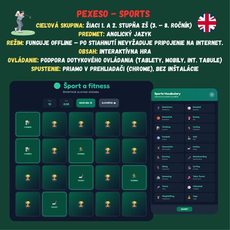 Premeňte hodinu angličtiny na napínavý tréning! Táto digitálna hra prenáša klasické pexeso do moderného športového prostredia. Žiaci sa hravou formou naučia pomenovať rôzne športové disciplíny od futbalu až po jogu alebo vzpieranie.