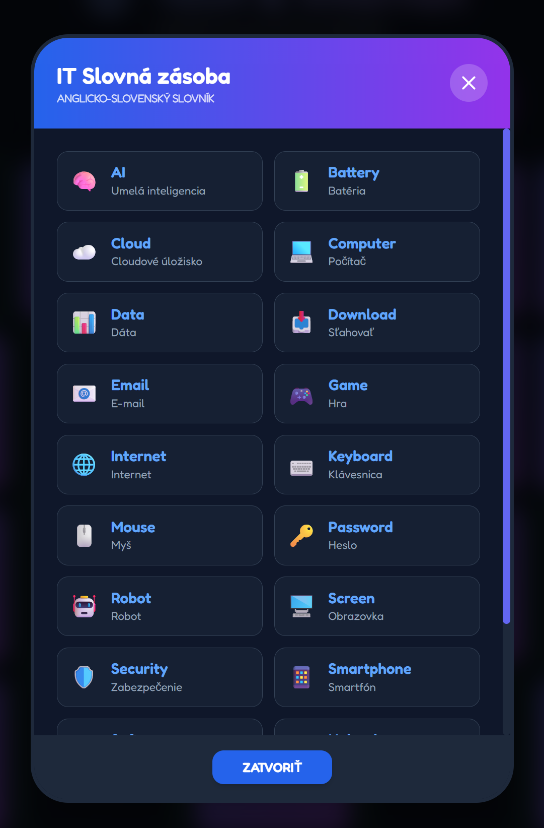 - 20 odborných pojmov: Rozdelených do kategórií hardvér, softvér, internet a bezpečnosť.