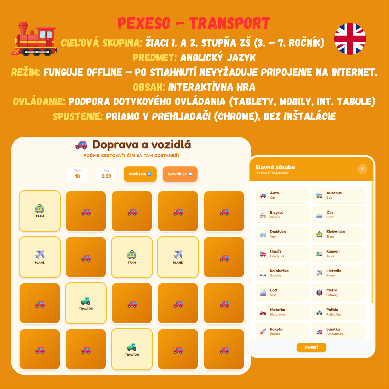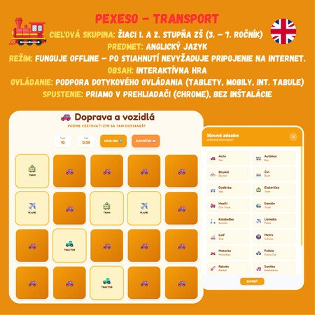 Premeňte hodinu angličtiny na napínavé preteky! Táto digitálna hra prenáša klasické pexeso do interaktívnej podoby, kde žiaci súperia s časom aj vlastnou pamäťou. Žiaci sa hravou formou naučia a upevnia slovnú zásobu týkajúcu sa dopravných prostriedkov, od bežných áut až po vesmírne rakety.