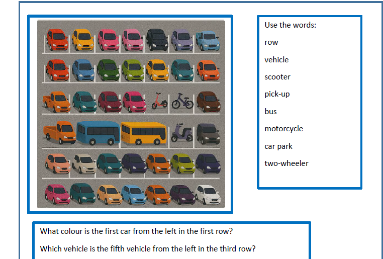Materiál Radové číslovky v angličtine je pracovný list určený pre 2. stupeň ZŠ v rámci predmetu anglický jazyk. Obsahuje sadu obrázkov (autá na parkovisku, polička so školskými potrebami, deti v rade, trieda so žiakmi, knihy na polici), ku ktorým sú pripravené otázky typu True/False aj otvorené otázky so zameraním na precvičovanie radových čísloviek v kontexte.