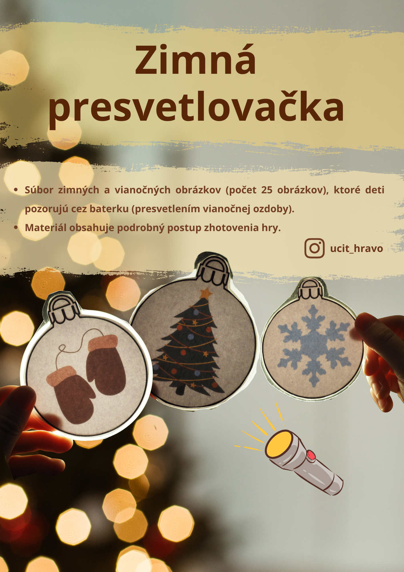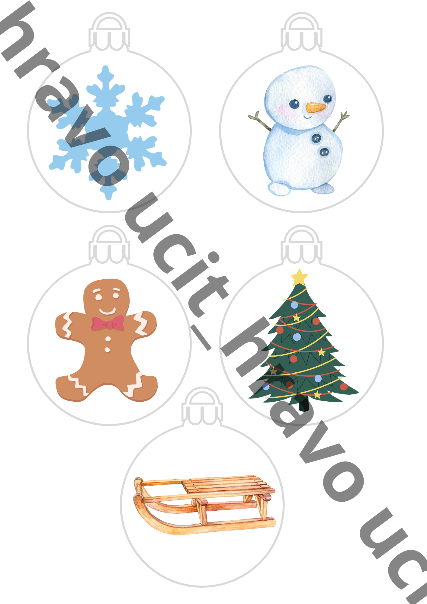 - Súbor obsahuje 25 vianočných ozdôb s obrázkom v zimnej a vianočnej tematike. Súčasťou je tiež strana s prázdnymi vianočnými ozdobami. Slúžia na prekrytie obrázka. Túto stranu je potrebné vytlačiť 4x (pre každú ozdobu s obrázkom je jedna prázdna ozdoba).