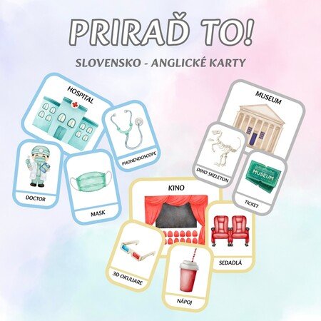 Kartičky sú určené na spoznávanie inštitúcii a priraďovanie príbuzných obrázkov, ktoré s nimi súvisia a patria k nim. Kartičky, ktoré patria k sebe sú označené rovnakou farbou. Na ANGLICKOM JAZYKU sa žiaci pomocou nich naučia slovenské aj anglické výrazy a uvedomia si, ako sa slovo píše v angličtine.