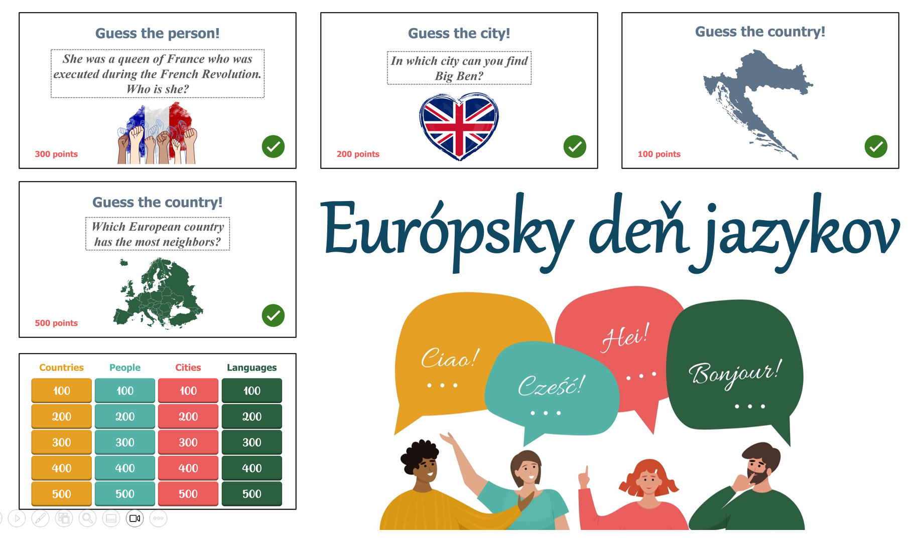 Interaktívna hra Riskuj! na tému Európsky deň jazykov je určená na zábavné opakovanie jazykov, krajín a základných kultúrnych poznatkov o Európe. Materiál je spracovaný formou prezentácie v PowerPointe.